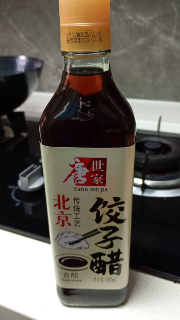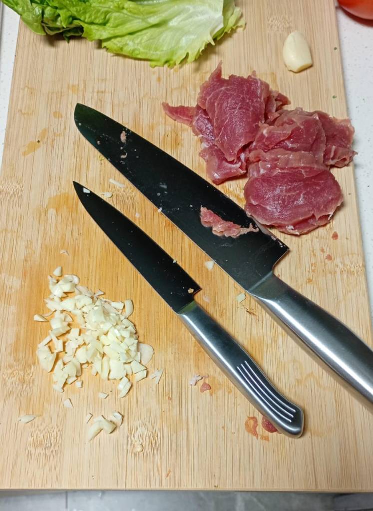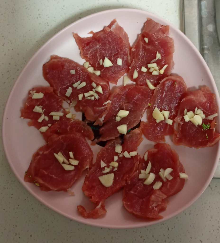 I cut the garlic in small pieces with the knives. Those knives are quite sharp. I felt quite the foreigner because I learned, watching chinese youtubers discuss chinese, that there is such thing as the Chinese Knife, and that they use it mostly for everything. A big rectangular knife. When I was looking for knives these ones did appear but I thought they were for fancy meat eating, not the national knife. In any case, the ones I got are really very good. I am satisfied. I cut the meat in slices and put the garlic on top of each slice. I thought I should have crushed the garlic and made it paste, but I didn’t have a good crusher and to do it with the back of the knife could be dangerous because they are very sharp. Then I put some 饺子醋 on the meat to marinate it. This is experimental cuisine and who knows what will happen at the end.