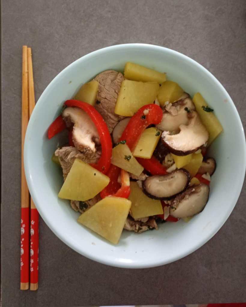 Then I diced some potatoes, red peppers, cilantro and the shitake mushrooms. I only have a metal wok, which I am not sure is the best because the point of the wok (as far as my limited studies in it go) is to cook thinks at low heat and let meat or so cook on their own juices as they bleed and sweat out of the heat in the wok pot. However, the fire in this burner even in the slow one makes the pot to go too hot, which causes the things to stick fast, unless you put oil or water. I have not used oil for cooking for almost a decade, I simply don’t use it (this started when I was 25 and was taking care of calories and gym progress and all. Was trying to reach 70 kg in weight, I got stuck in 73-74 when the pandemic started…) I usually use water, however, water makes things to bleed in a way that they sometimes get a milder flavour, so I try to use it less in the wok. I had to use it here to make the things not stick and burn.