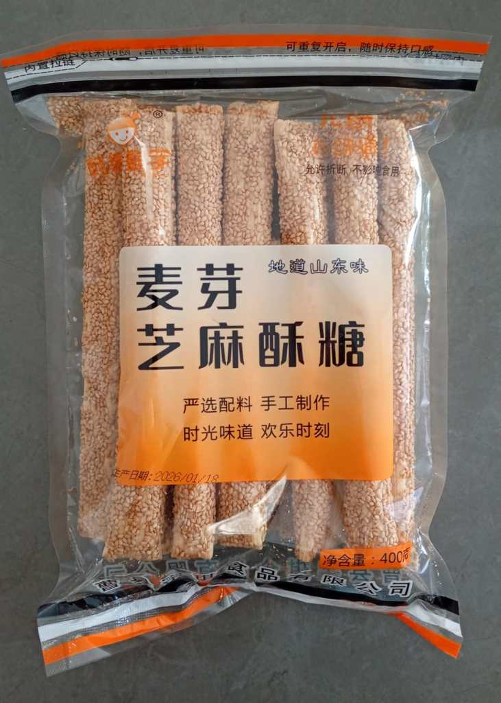 It actually tastes very good. It is crunchy. The big black characters are 麦 芽 芝 麻 酥 糖 which get divided in words in pairs: maiya zhima sutang (with some tones). This basically means Sesame_Malt _crunchy candy according to my research online which makes a lot of sense, given the object we are seeing. I tried it and I liked it and I ate three of them and then said the rest for other days because we don’t want to only eat this.