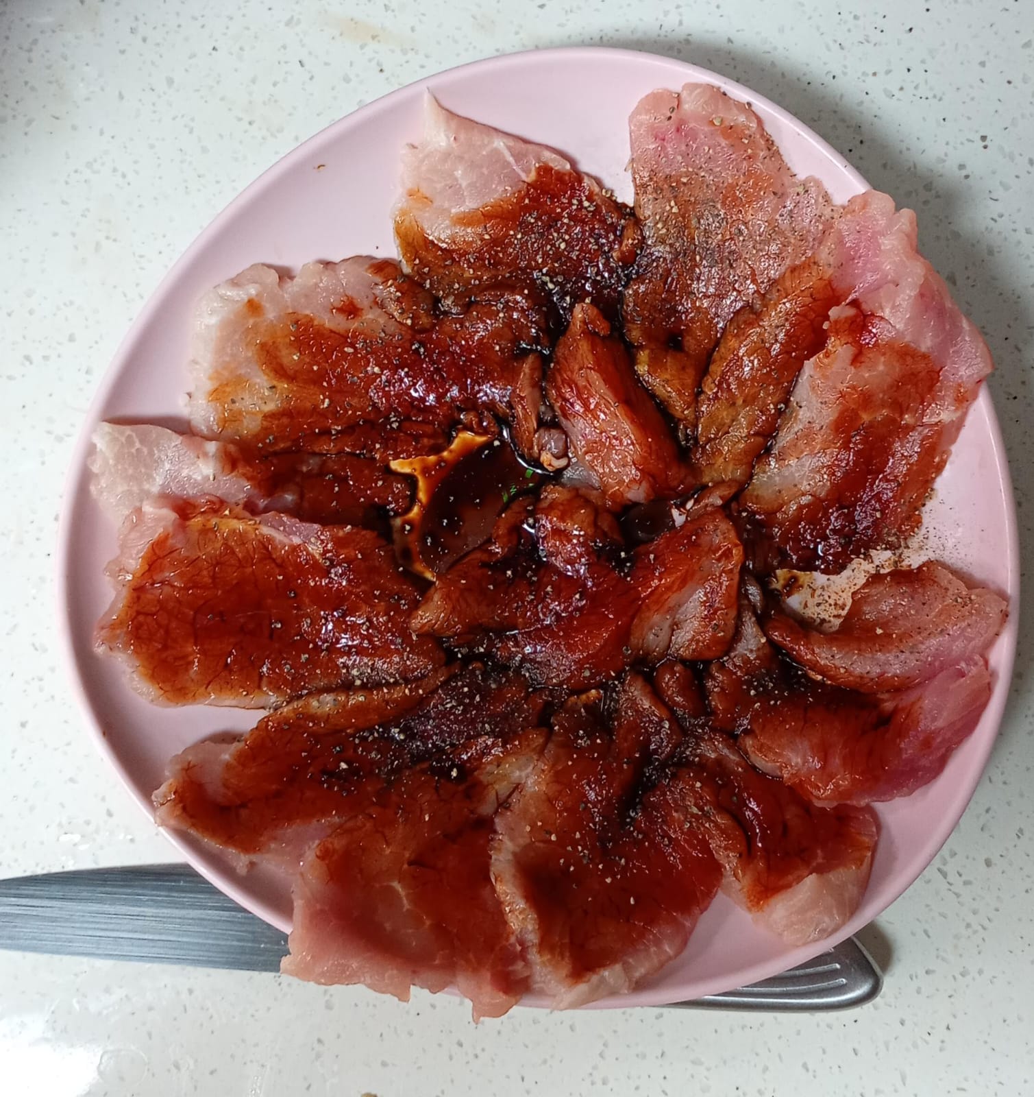 - I put the slices of meat in a dish and pour the red cooking soy sauce on it. Not much, I use a small spoon and a half. Then I make sure everything is coated in it.