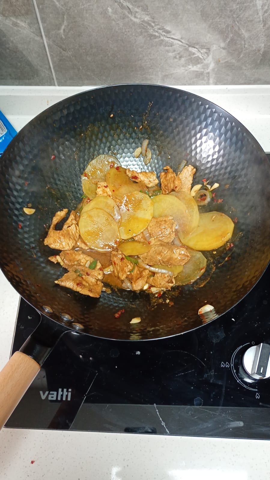 - I pout a bit of water to make sure nothing burns or sticks. I keep stirring and throw the potato slices and the meat.