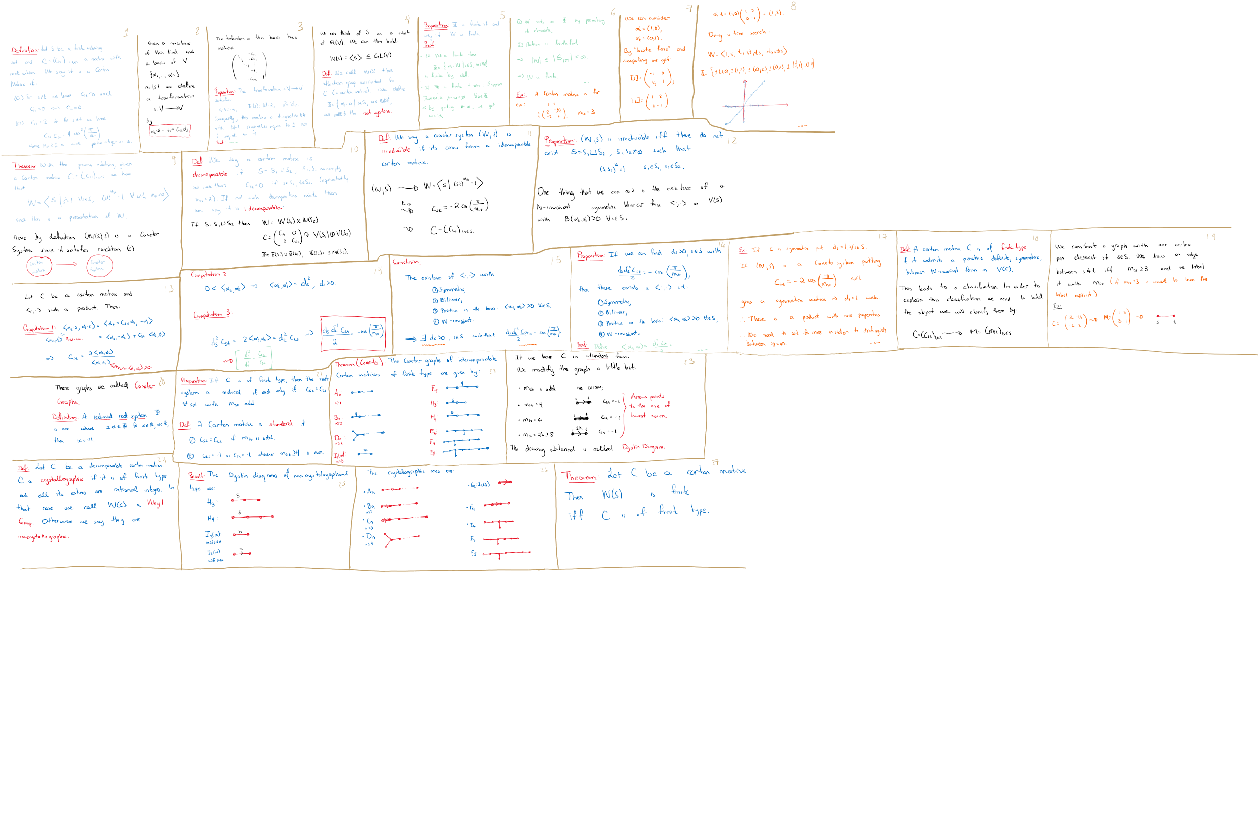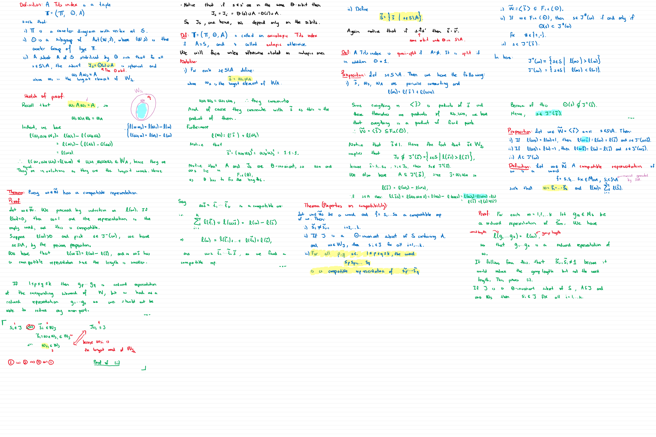 | July 20 | We introduced again the notion of Tits Index and some definitions. We are working toward obtaining the notion of relative Tits index. In the process we defined: anisotropic, isotropic, split and quasi-split Tits indices. [4] Chapter 20, Definition 20.1 up to Lemma 20.20. | N/A | |