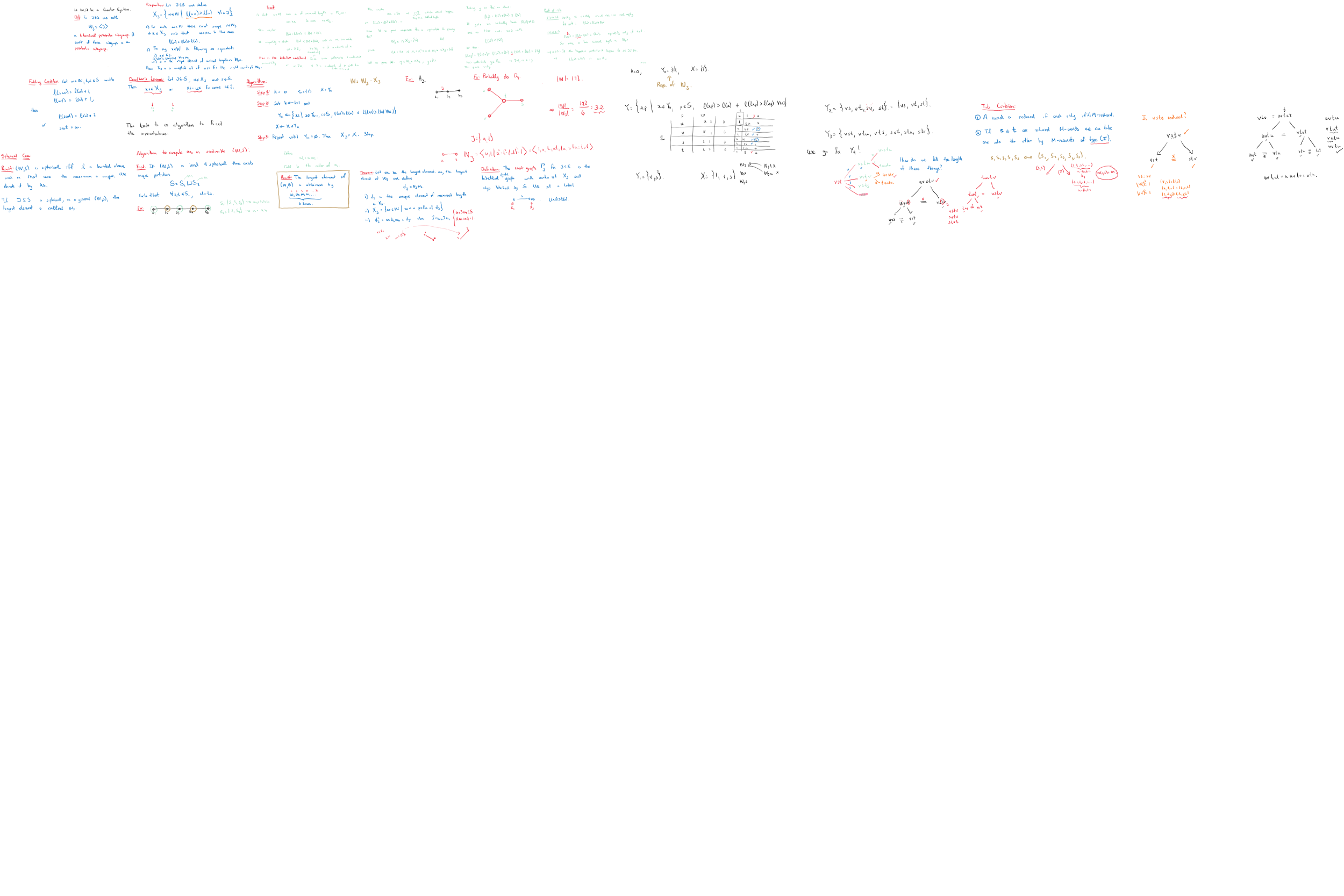 | May 25 | We saw the set of notes except for the parts of double cosets. We will return to them later. We studied algorithmical aspects of Coxeter Systems: computing system of representatives for parabolic subgroups, computing the longest word in spherical buidlings, and discussed the coset graph briefly. We recalled the concept of M-reduced words and saw how together with folding we can actually make the computations required to do these algorithms. [1] Chapter 2, Theorem 2.33 [5] Chapter 1, section 1.5 Chapter 2, section 2.1 and 2.2 | ||