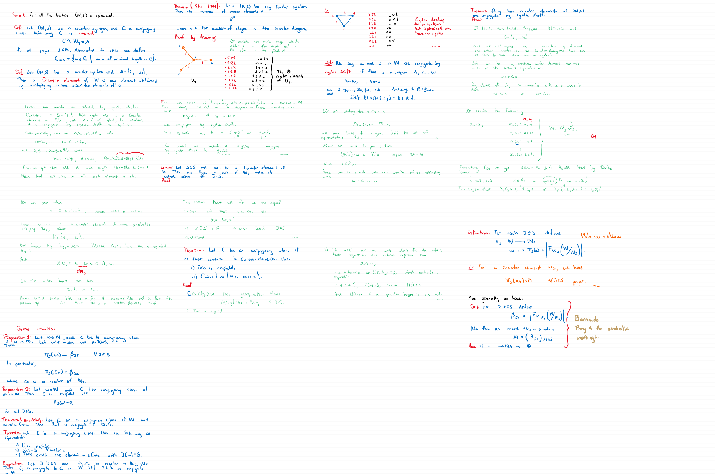 | June 1 | We discussed conjugacy classes in coxeter classes, in particular the cuspidal ones and how we can understand them via coxeter elements. [5] Chapter 3, section 3.1. | ||