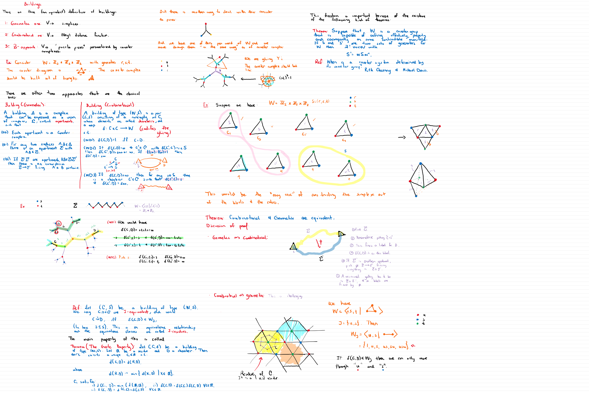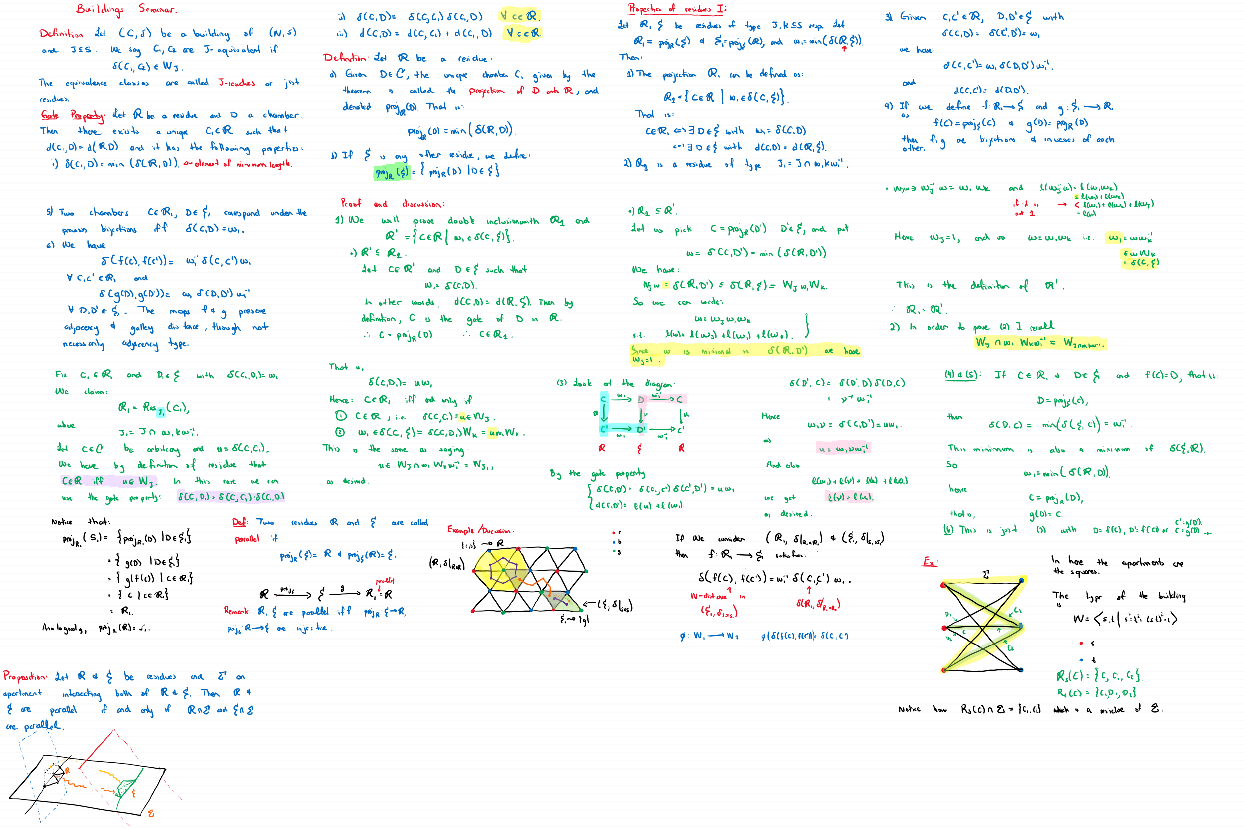 | June 22 | We defined residues in a building and stated the gate property. In order to understand its proof we discussed the version of the triangle inequality for the Weyl Distance. We didn’t finish the proof of the gate property, as we spent almost all class discussing the triangle inequality and what appears in the board is the incomplete proof (just the start…). [1] Chapter 5, section 5.3. Lemma 5.28 is the triangle inequality and Proposition 5.34 is the Gate property. [4] Chapter 21, Lemma 21.5 is the triangle inequality and Lemma 21.6 is the Gate property. Thus book doesn’t call them like this. | N/A | |