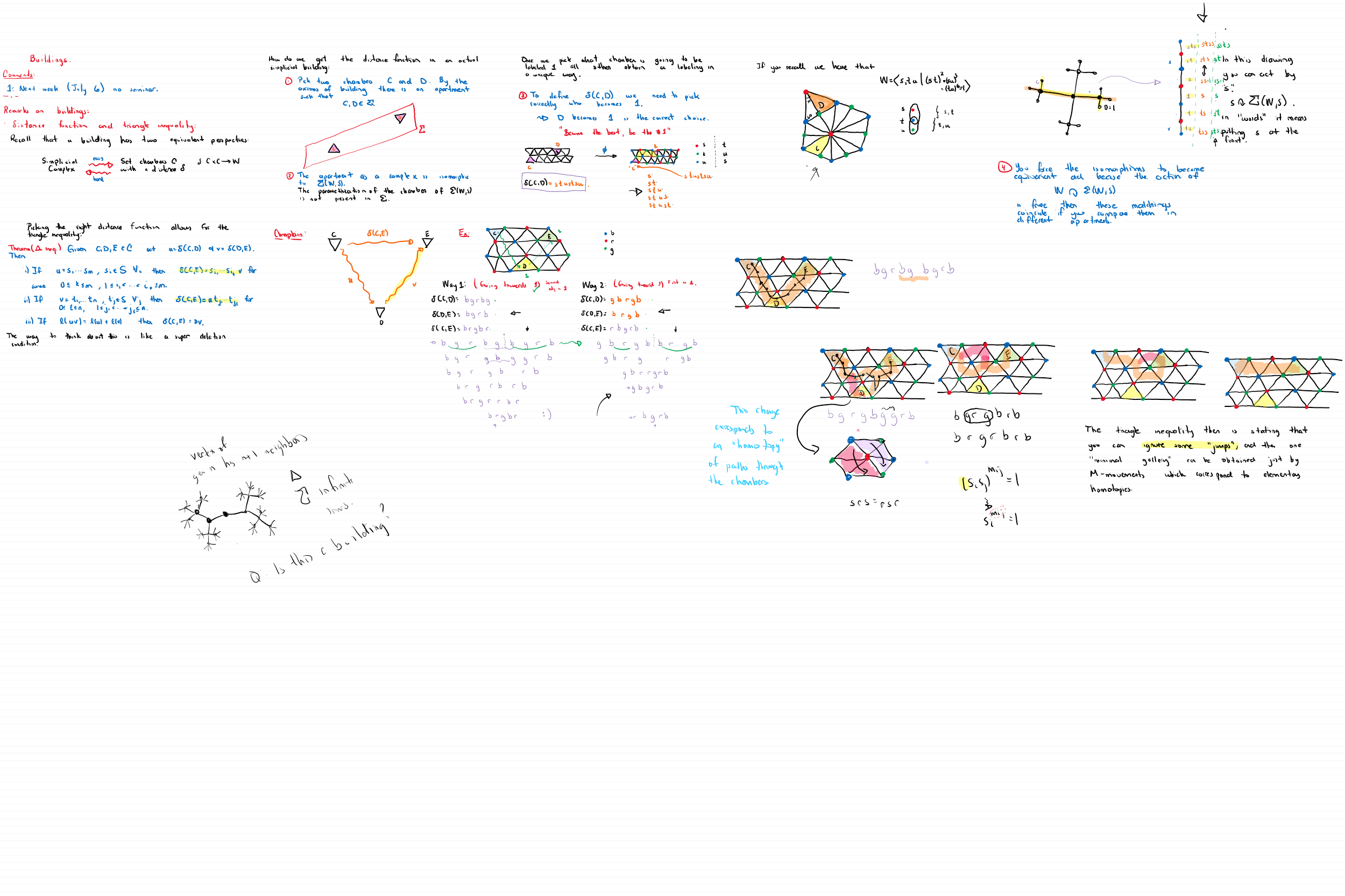 | June 29 | This class was dedicated to understand in a better way the triangle inequality and the construction of the Weyl distance function of a building from the distance functions of its apartments. We also discussed how the relationship of the weyl distance and a word decomposition has to do with galleries and homotopies. In a certain sense, this class’ topics should go before the previous ones but the doubts arised after that class. [1] Chapter 3, section 3.5 for the construction of the Weyl distance function of a coxeter complex (i.e. an apartment). Chapter 3, section 3 and chapter 4, section 4.12 to see more about homotopy of buildings. Chapter 4, section 4.8 for the Weyl distance function in the Building case. | N/A | |